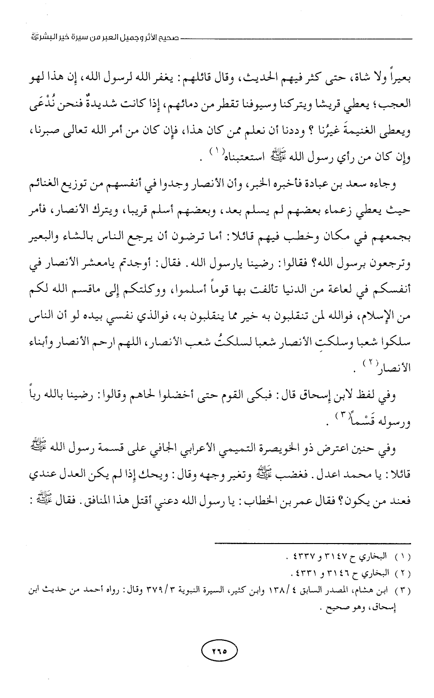 وجاءه سعد بن عبادة فأخبره الخبر، وأن الأنصار وجدوا في أنفسهم من توزيع الغنائم حيث يعطي زعماء بعضهم لم يسلم بعد، وبعضهم أسلم قريبا، ويترك الأنصار، فأمر بجمعهم في مكان وخطب فيهم قائلا: أما ترضون أن يرجع الناس بالشاء والبعير وترجعون برسول الله؟ فقالوا: رضينا يا رسول الله. فقال: أوجدتم يا معشر الأنصار في أنفسكم في لعاعة من الدنيا تألفت بها قومًا أسلموا، ووكلتكم إِلى ما قسم الله لكم من الإِسلام، فوالله لمن تنقلبون به خير مما ينقلبون به، فوالذي نفسي بيده لو أن الناس سلكوا شعبا وسلكتِ الأنصار شعبا لسلكتُ شعب الأنصار، اللهم ارحم الأنصار وأبناء الأنصار (¬2).