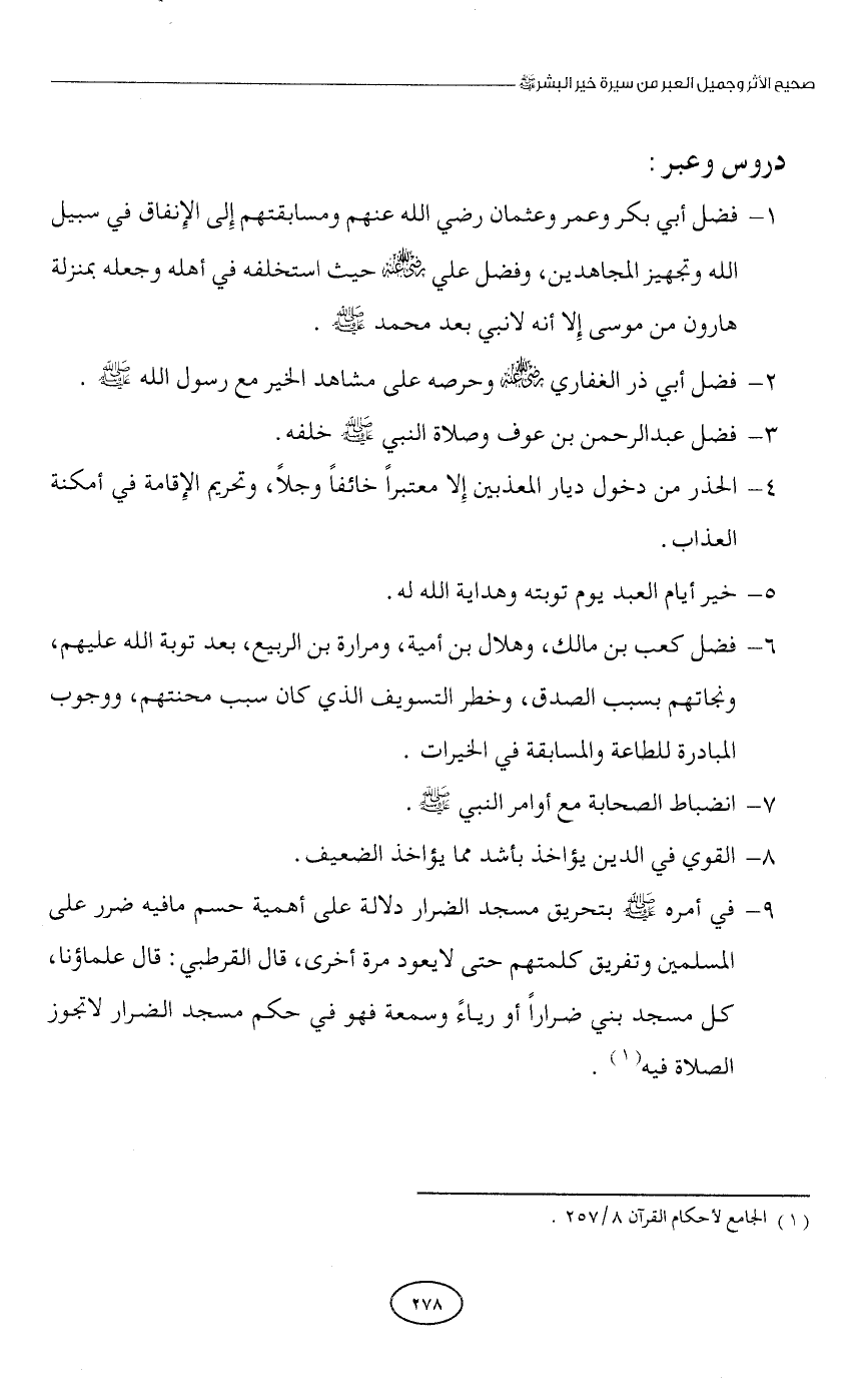 9 - في أمره - صلى الله عليه وسلم - بتحريق مسجد الضرار دلالة على أهمية حسم ما فيه ضرر على المسلمين وتفريق كلمتهم حتى لا يعود مرة أخرى، قال القرطبي: قال علماؤنا، كل مسجد بني ضرارًا أو رياءً وسمعة فهو في حكم مسجد الضرار لا تجوز الصلاة فيه (¬1).