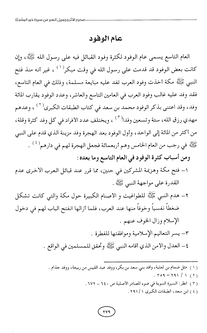 العام التاسع يسمى عام الوفود لكثرة وفود القبائل فيه على رسول الله - صلى الله عليه وسلم -، وإِن كانت بعض الوفود قد قدمت على رسول الله في وقت مبكر (¬1)، غير أنه منذ فتح النبي - صلى الله عليه وسلم - مكة أخذت وفود العرب تفد عليه مبايعة مسلمة، وذلك في العام التاسع، فقد وفد عليه غالب وفود العرب في العامين التاسع والعاشر، وعدد الوفود يقارب المائة وفد، وقد اعتنى بذكر الوفود محمَّد بن سعد في كتاب الطبقات الكبرى (¬2)، وعدهم مهدي رزق الله، ستة وتسعين وفدا (¬3)، ويختلف عدد الأفراد في كل وفد كثرة وقلة، من أكثر من المائة إِلى الواحد، وأول الوفود بعد الهجرة وفد مزينة الذي قدم على النبي - صلى الله عليه وسلم - في رجب من العام الخامس وهم أربعمائة فجعل الهجرة لهم في دارهم (¬4).