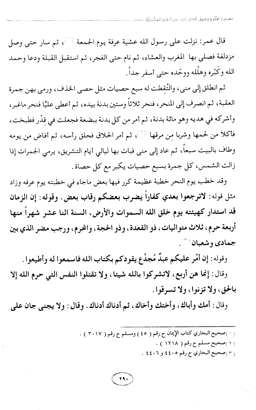 وقد خطب يوم النحر خطبة عظيمة كرر فيها بعض ما جاء في خطبته يوم عرفه وزاد مثل قوله: لا ترجعوا بعدي كفارًا يضرب بعضكم رقاب بعض. وقوله: إِن الزمان قد استدار كهيئته يوم خلق الله السموات والأرض، السنة اثنا عشر شهرًا منها أربعة حرم، ثلاث متواليات، ذو القعدة، وذو الحجة، والمحرم، ورجب مضر الذي بين جمادى وشعبان (¬3).
