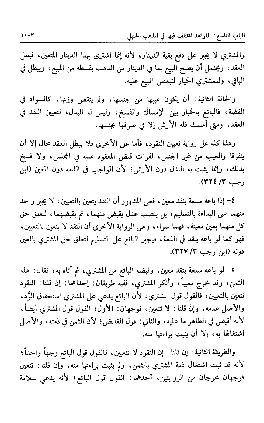 ٤ - إذا باعه سلعة بنقد معين، فعلى المشهور أن النقد يتعين بالتعيين، لا يجبر واحد منهما على البداءة بالتسليم، بل ينصب عدل يقبض منهما، ثم يقبضهما، لتعلق حق كل منهما بعين معينة، فهما سواء، وعلى الروإية الأخرى أن النقد لا يتعين بالتعيين.