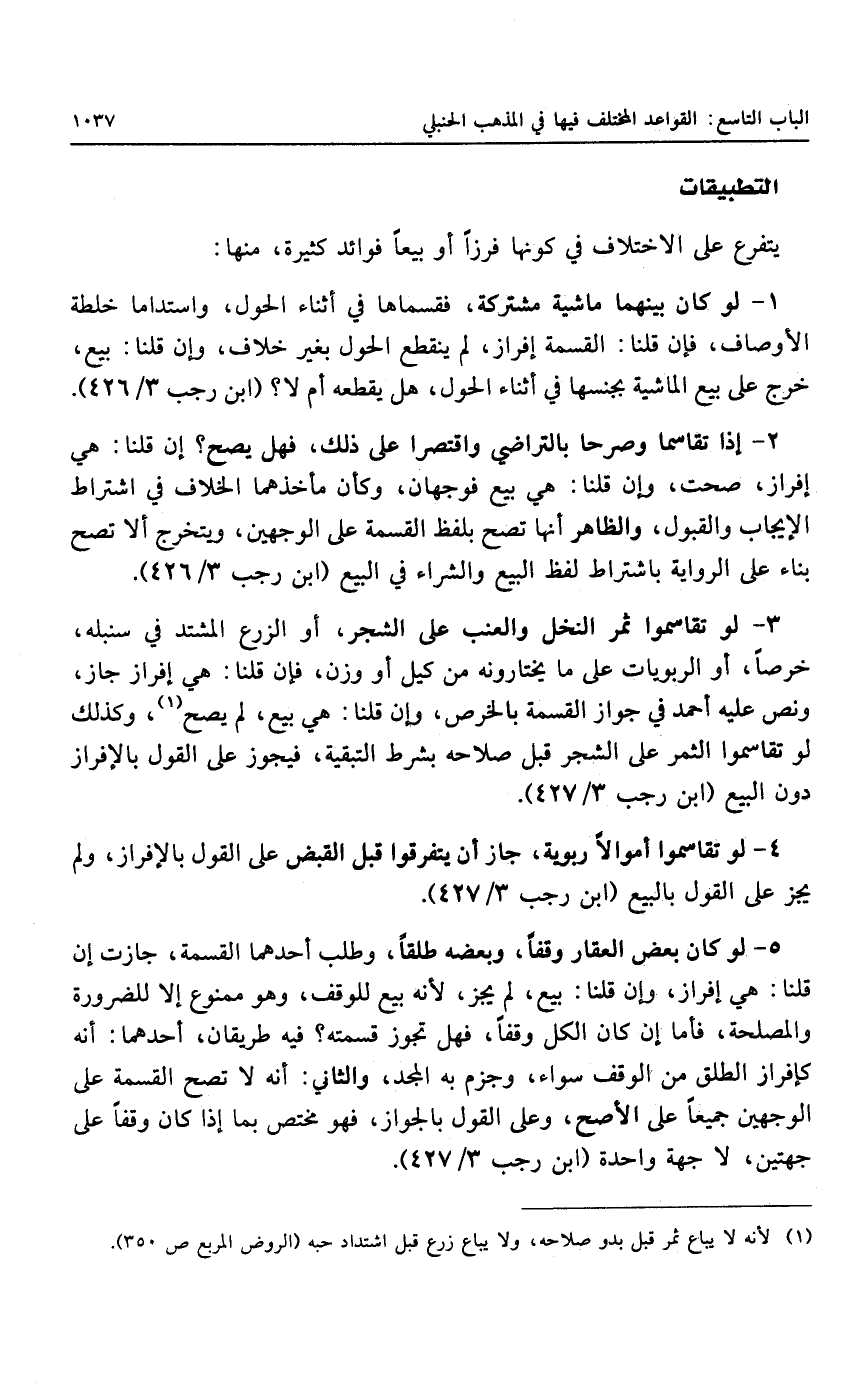 ٥ - لو كان بعض العقار وقفاً، وبعضه طلقاً، وطلب أحدهما القسمة، جازت إن قلنا: هي إفراز، وإن قلنا: بيع، لم يجز، لأنه بيع للوقف، وهو ممنوع إلا للضرورة والمصلحة، فأما إن كان الكل وقفاً، فهل تجوز قسمته؛ فيه طريقان، أحدهما: أنه كإفراز الطلق من الوقف سواء، وجزم به المجد، والثاني: أنه لا تصح القسمة على الوجهين جميعاً على الأصح، وعلى القول بالجواز، فهو مختص بما إذا كان وقفاً على جهتين، لا جهة واحدة.