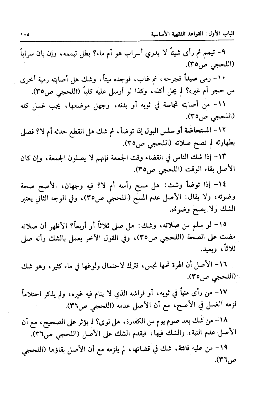 ١٧ - من رأى منياً في ثوبه، أو فراشه الذي لا ينام فيه غيره، ولم يذكر احتلاماً لزمه الغسل في الأصح، مع أن الأصل عدمه.