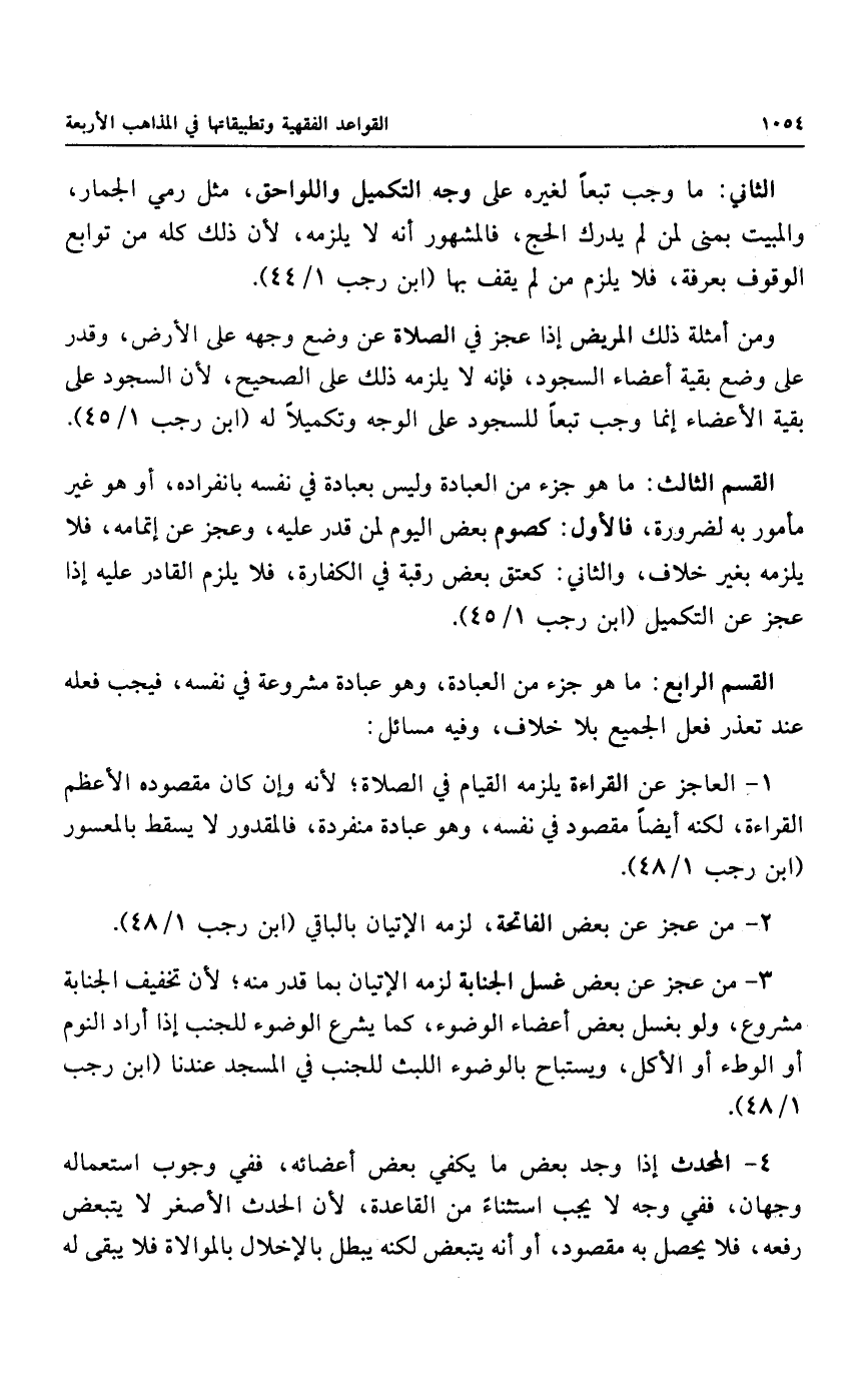 القسم الرابع: ما هو جزء من العبادة، وهو عبادة مشروعة في نفسه، فيجب فعله عند تعذر فعل الجميع بلا خلاف، وفيه مسائل: