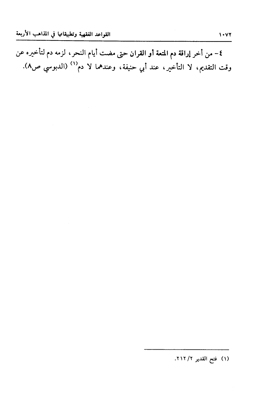 ٤ - من أخر إراقة دم المتعة أو القران حتى مضت أيام النحر، لزمه دم لتأخيره عن وقت التقديم، لا التأخير، عند أبي حنيفة، وعندهما لا دم.