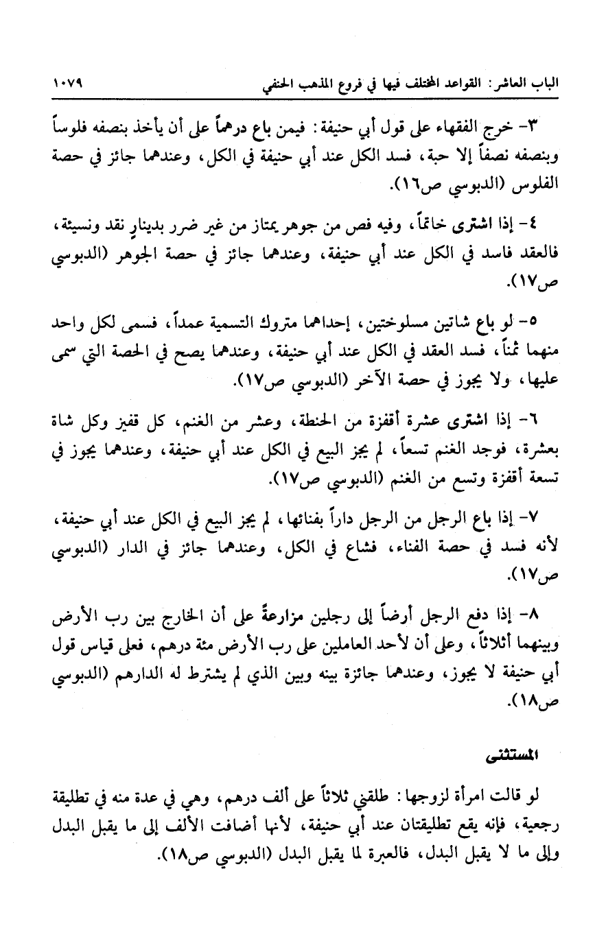 ٣ - خرج الفقهاء على قول أبي حنيفة: فيمن باع درهماً على أن يأخذ بنصفه فلوساً وبنصفه نصفاً إلا حبة، فسد الكل عند أبي حنيفة في الكل، وعندهما جائز في حصة الفلوس.