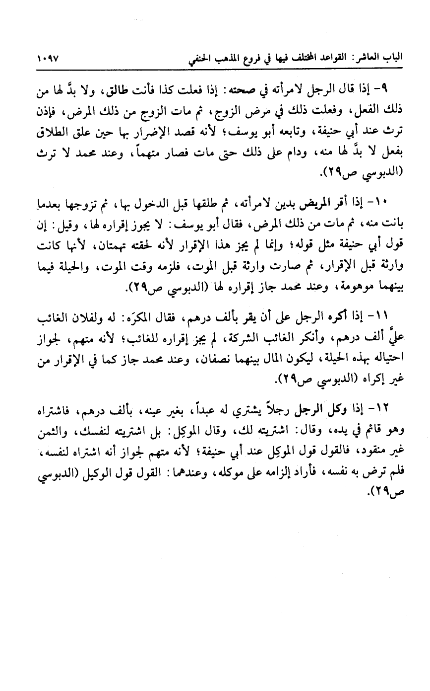 ٩ - إذا قال الرجل لامرأته في صحته: إذا فعلت كلذا فأنت طالق، ولا بدَّ لها من ذلك الفعل، وفعلت ذلك في مرض الزوج، ثم مات الزوج من ذلك المرض، فإذن ترث عند أبي حنيفة، وتابعه أبو يوسف؛ لأنه قصد الإضرار بها حين علق الطلاق بفعل لا بدَّ لها منه، ودام على ذلك حتى مات فصار متهماً، وعند محمد لا ترث.