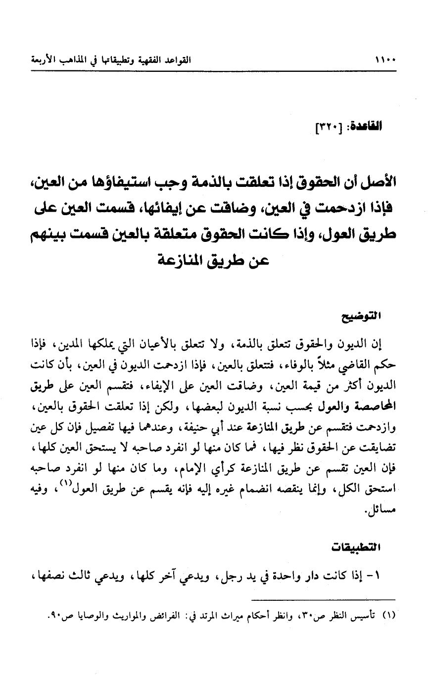 إن الديون والحقوق تتعلق بالذمة، ولا تتعلق بالأعيان التي يملكها المدين، فإذا حكم القاضي مثلاً بالوفاء، فتتعلق بالعين، فإذا ازدحمت الديون في العين، بأن كانت الديون أكثر من قيمة العين، وضاقت العين على الإلفاء، فتقسم العين على طريق المحاصصة والعول بحسب نسبة الديون لبعضها، ولكن إذا تعلقت الحقوق بالعين.