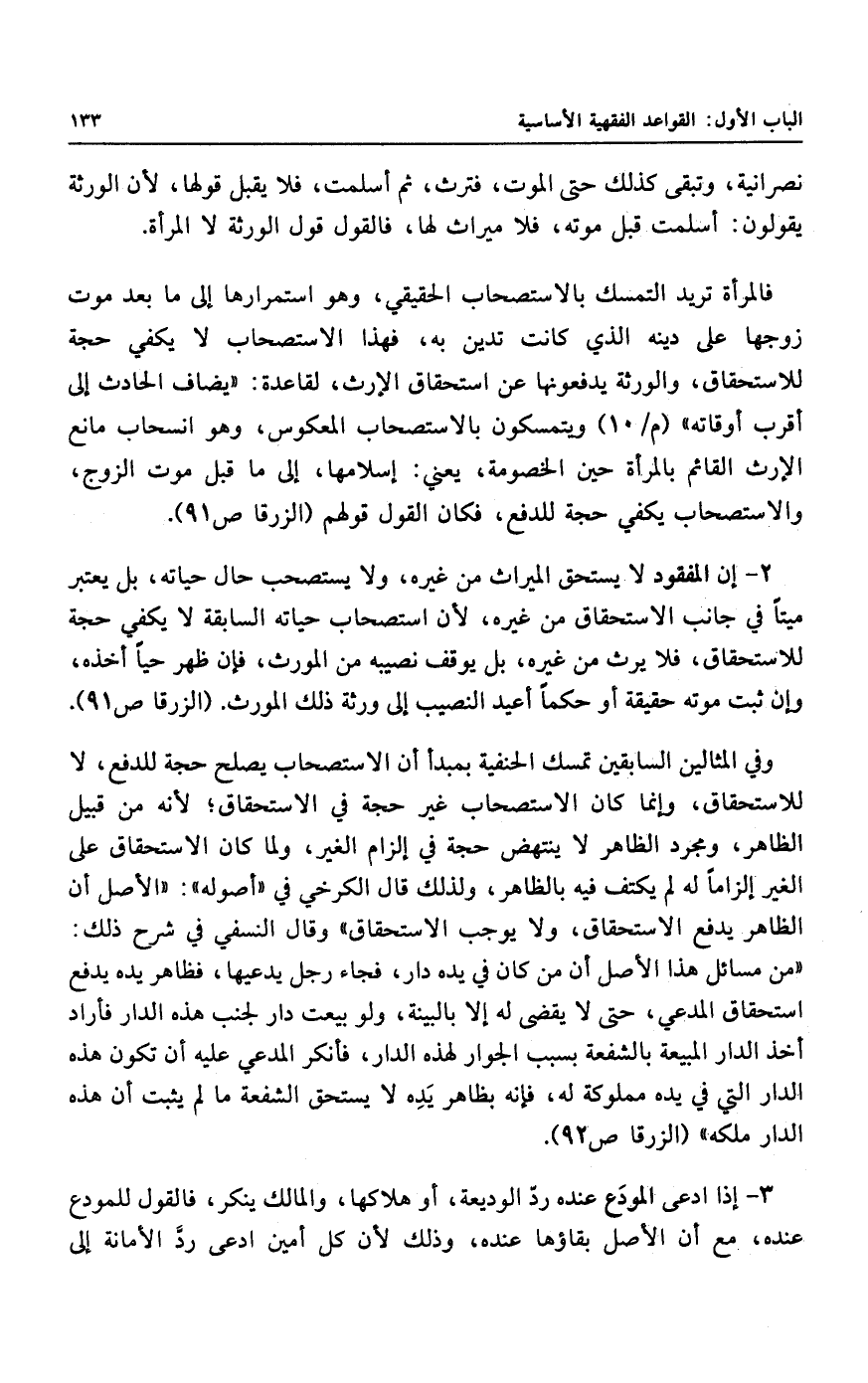 فالمرأة تريد التمسك بالاستصحاب الحقيقي، وهو استمرارها إلى ما بعد موت زوجها على دينه الذي كانت تدين به، فهذا الاستصحاب لا يكفي حجة للاستحقاق، والورثة يدفعونها عن استحقاق الإرث، لقاعدة: "يضاف الحادث إلى أقرب أوقاته". (م/ ١٠)