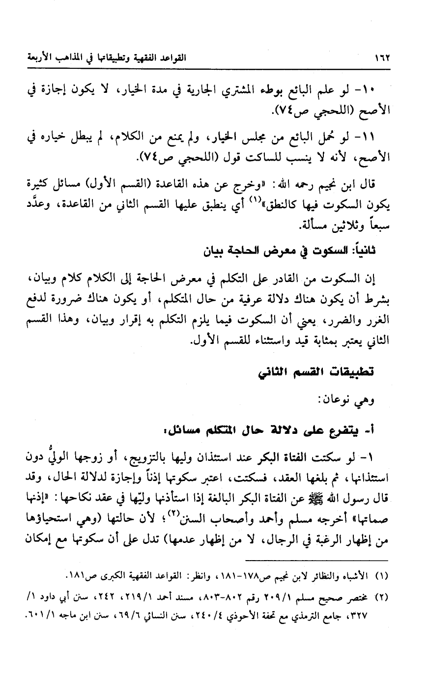 إن السكوت من القادر على التكلم في معرض الحاجة إلى الكلام كلام وبيان، بشرط أن يكون هناك دلالة عرفية من حال المتكلم، أو يكون هناك ضرورة لدفع الغرر والضرر، يعني أن السكوت فيما يلزم التكلم به إقرار وبيان، وهذا القسم الثاني يعتبر بمثابة قيد واستثناء للقسم الأول.