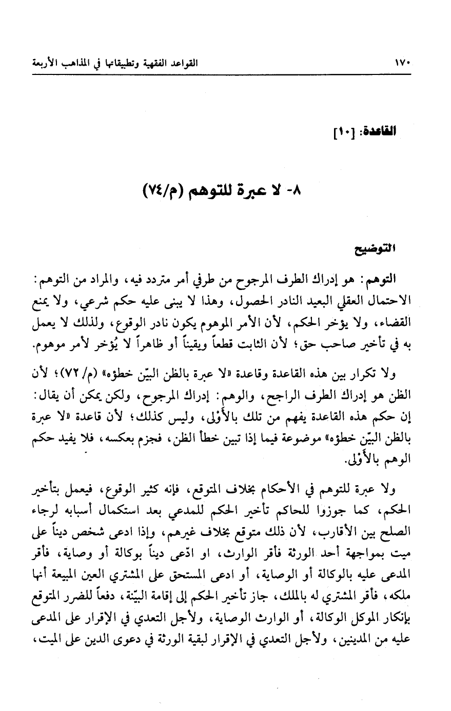 ولا عبرة للتوهم في الأحكام بخلاف المتوقع، فإنه كثير الوقوع، فيعمل بتأخير الحكم، كما جوزوا للحاكم تأخير الحكم للمدعي بعد استكمال أسبابه لرجاء الصلح بين الأقارب، لأن ذلك متوقع بخلاف غيرهم، وإذا ادعى شخص ديناً على ميت بمواجهة أحد الورثة فأقرَّ الوارث، او ادعى ديناً بوكالة أو وصاية، فأقرَّ المدعى عليه بالوكالة أو الوصاية، أو ادعى المستحق على المشتري العين المبيعة أنها ملكه، فأقرَّ المشتري له بالملك، جاز تأخير الحكم إلى إقامة البينة، دفعاً للضرر المتوقع بإنكار الوكل الوكالة، أو الوارث الوصاية، ولأجل التعدي في الإقرار على المدعى عليه من المدينين، ولأجل التعدي في الإقرار لبقية الورثة في دعوى الدين على الميت،