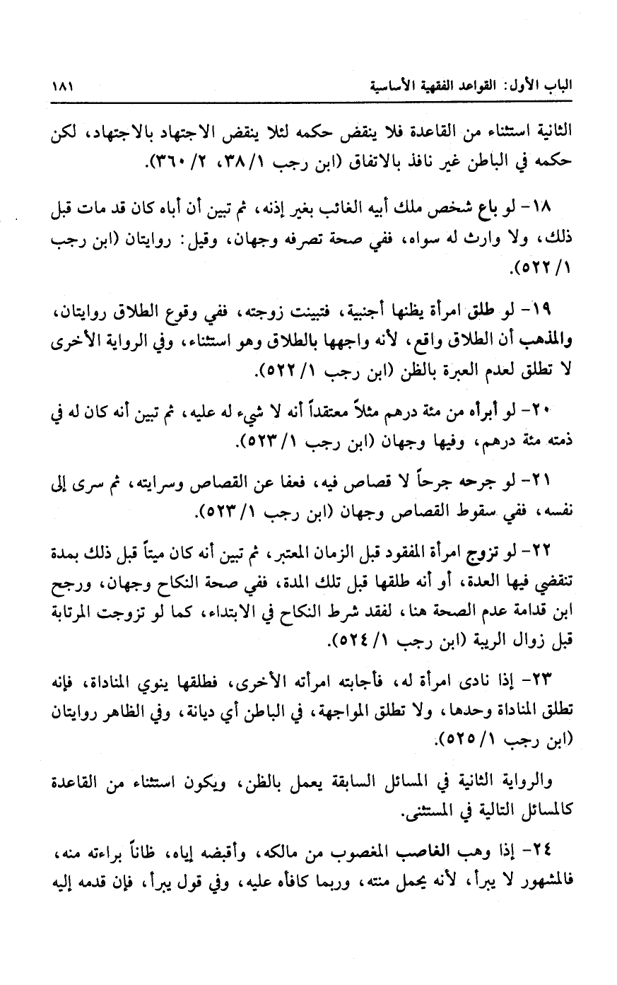 ١٩ - لو طلق امرأة يظنها أجنبية، فتبينت زوجته، ففي وقوع الطلاق روايتان، والمذهب أن الطلاق واقع، لأنه واجهها بالطلاق وهو استثناء، وفي الرواية الأخرى لا تطلق لعدم العبرة بالظن.