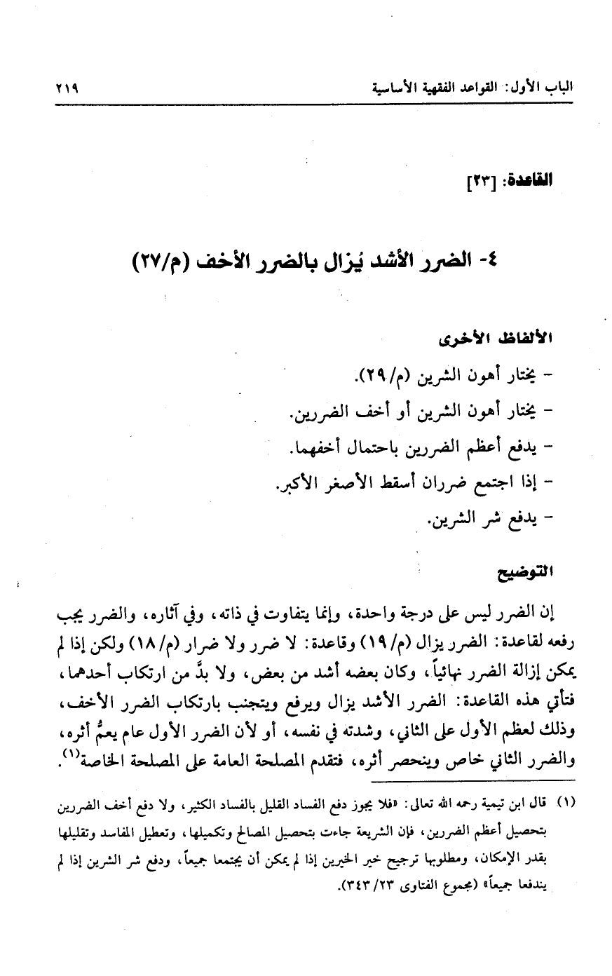 (١) قال ابن تيمية رحمه الله تعالى: " فلا يجوز دفع الفساد القليل بالفساد الكثير، ولا دفع أخف الضررين بتحصيل أعظم الضررين، فإن الشريعة جاءت بتحصيل المصالح وتكميلها، وتعطيل المفاسد وتقليلها