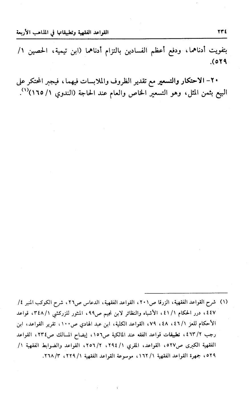 ٢٠ - الاحتكار والتسعير مع تقدير الظروف والملابسات فيهما، فيجبر المحتكر على البيع بثمن المثل، وهو التسعير الخاص والعام عند الحاجة (الندوي ١/ ١٦٥) .