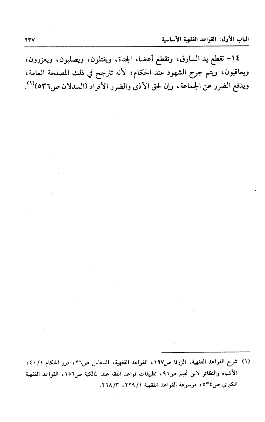 ١٤ - تقطع يد السارق، وتقطع أعضاء الجناة، ويقتلون، ويصلبون، ويعزرون، ويعاقبون، ويتم جرح الشهود عند الحكام؛ لأنه تترجح في ذلك المصلحة العامة، ويدفع الضرر عن الجماعة، وإن لَحِقَ الأذى والضرر الأفراد.