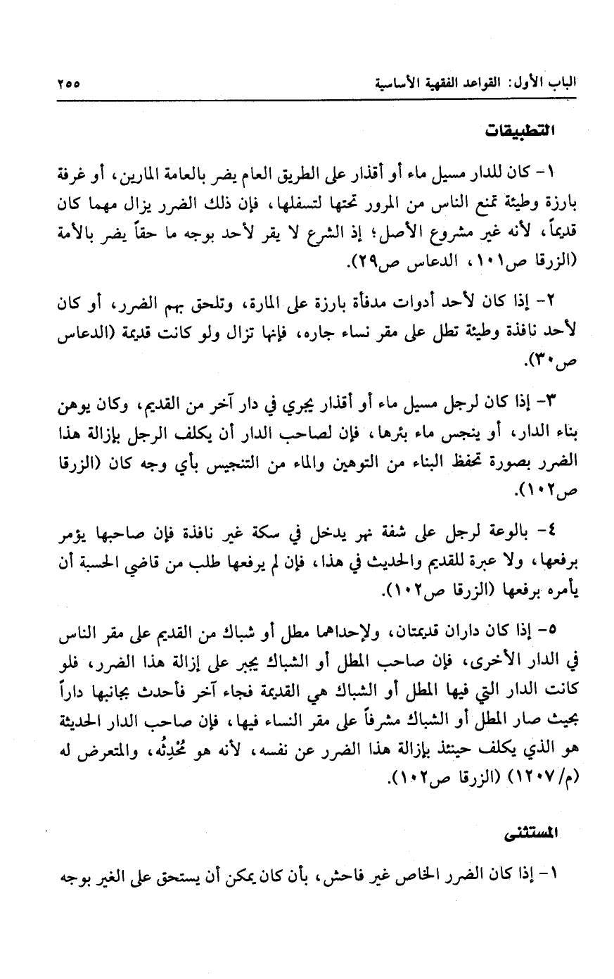 ١ - كان للدار مسيل ماء أو أقذار على الطريق العام يضر بالعامة المارين، أو غرفة بارزة وطيئة تمنع الناس من المرور تحتها لتسفلها، فإن ذلك الضرر يزال مهما كان قديماً، لأنه غير مشروع الأصل؛ إذ الشرع لا يقر لأحد بوجه ما حقاً يضر بالأمة.