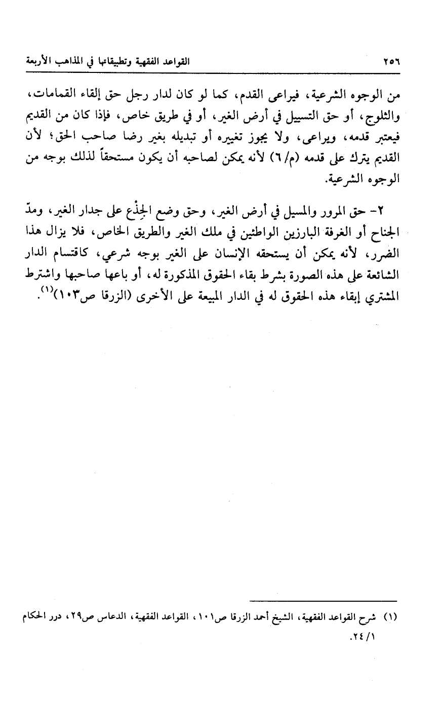 ٢ - حق المرور والمسيل في أرض الغير، وحق وضع الجِذْع على جدار الغير، ومدّ الجناح أو الغرفة البارزين الواطئين في ملك الغير والطريق الخاص، فلا يزال هذا الضرر، لأنه يمكن أن يستحقه الإنسان على الغير بوجه شرعي، كاقتسام الدار الشائعة على هذه الصورة بشرط بقاء الحقوق المذكورة له، أو باعها صاحبها واشترط المشتري إبقاء هذه الحفوق له في الدار المبيعة على الأخرى.