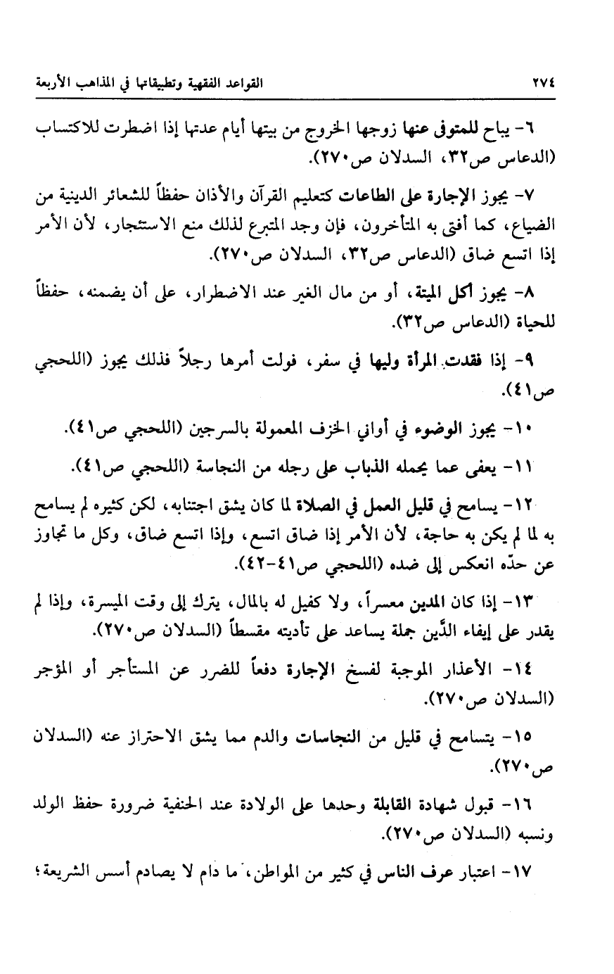 ٦ - يباح للمتوفى عنها زوجها الخروج من بيتها أيام عدتها إذا اضطرت للاكتساب.