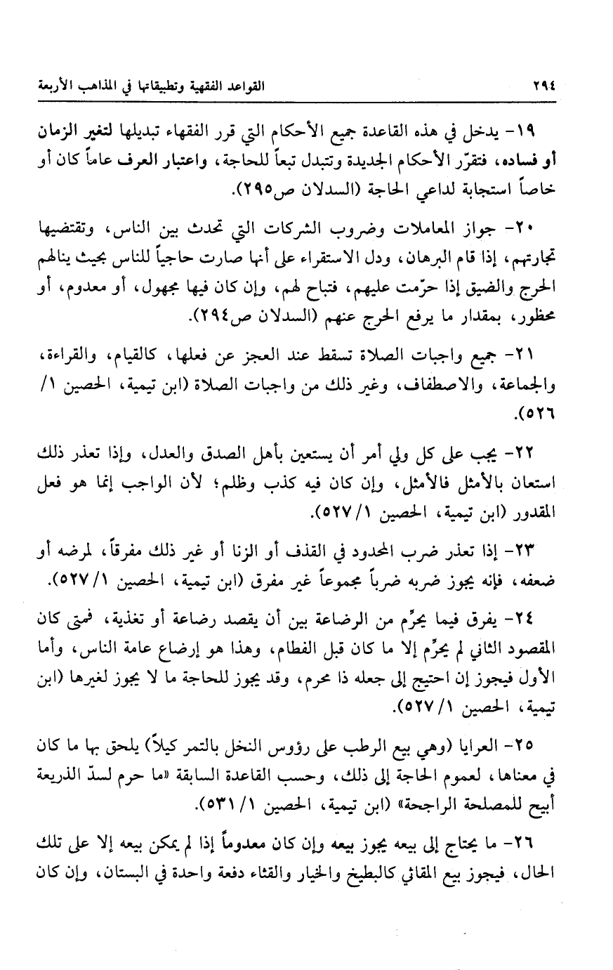 ١٩ - يدخل في هذه القاعدة جميع الأحكام التي قرر الفقهاء تبديلها لتغير الزمان أو فساده، فتقرّر الأحكام الجديدة وتتبدل تبعاً للحاجة، واعتبار العرف عاماً كان أو خاصاً استجابة لداعي الحاجة.