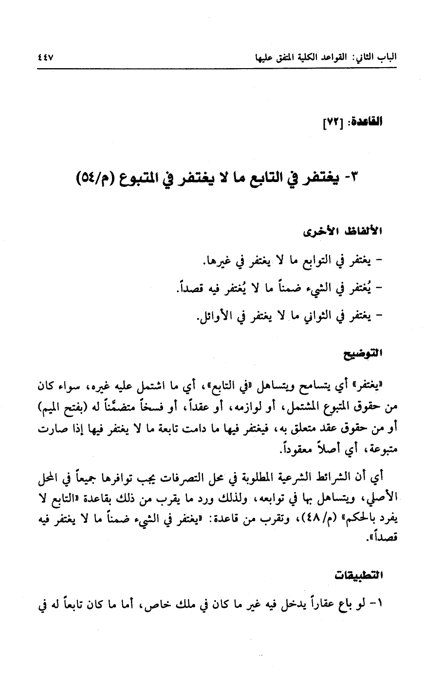 أي أن الشرائط الشرعية المطلوبة في محل التصرفات يجب توافرها جميعاً في المحل الأصلي، ويتساهل بها في توابعه، ولذلك ورد ما يقرب من ذلك بقاعدة ة التابع لا يفرد بالحكم " (م/٤٨) .