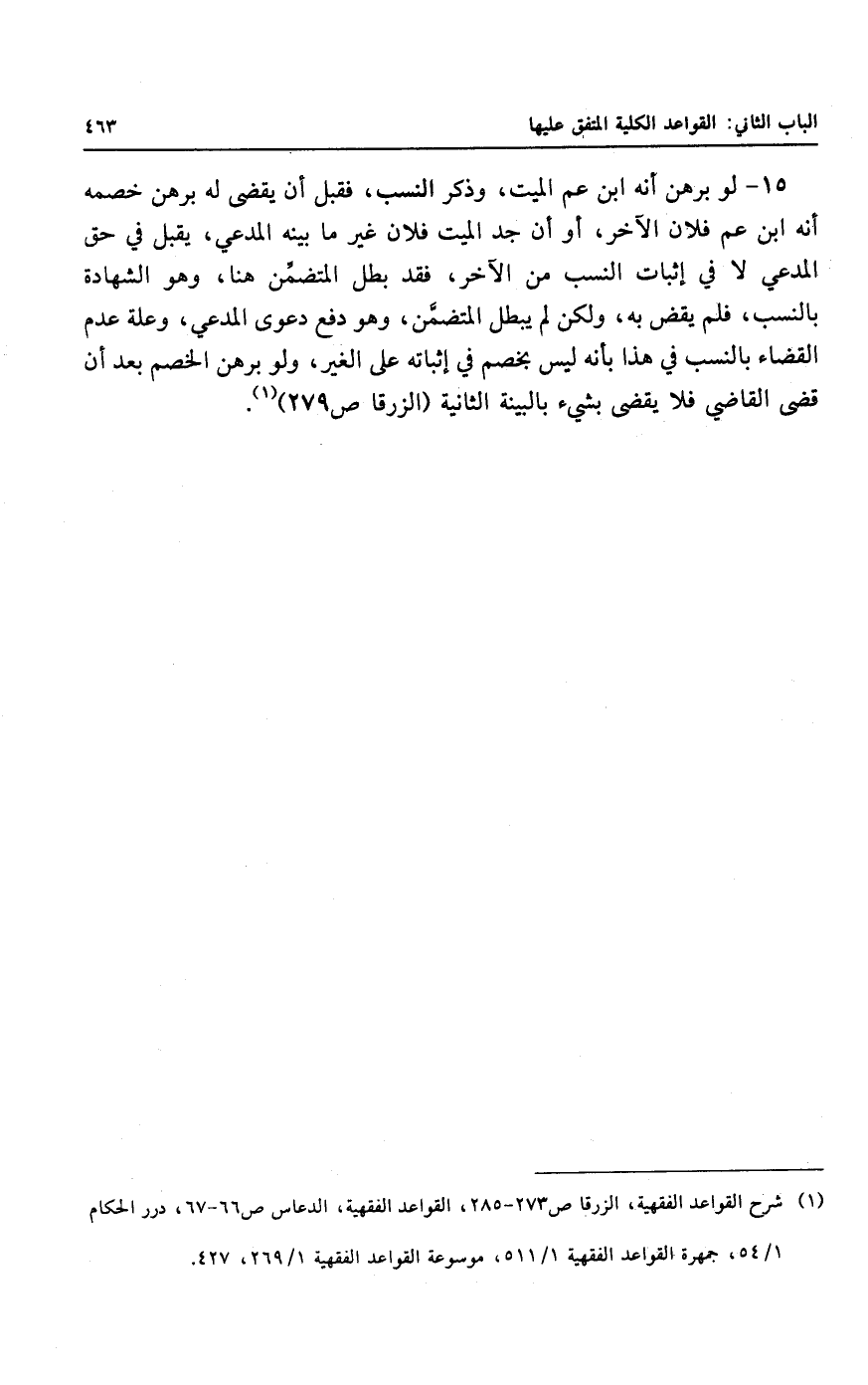 ١٥ - لو برهن أنه ابن عم الميت، وذكر النسب، فقبل أن يقضى له برهن خصمه أنه ابن عم فلان الآخر، أو أن جد الميت فلان غير ما بينه المدعي، يقبل في حق المدعي لا في إثبات النسب من الآخر، فقد بطل المتضمن هنا، وهو الشهادة بالنسب، فلم يقض به، ولكن لم يبطل المتضمَّن، وهو دفع دعوى المدعي، وعلة عدم القضاء بالنسب في هذا بأنه ليس بخصم في إثباته على الغير، ولو برهن الخصم بعد أن قضى القاضي فلا يقضى بشيء بالبينة الثانية.