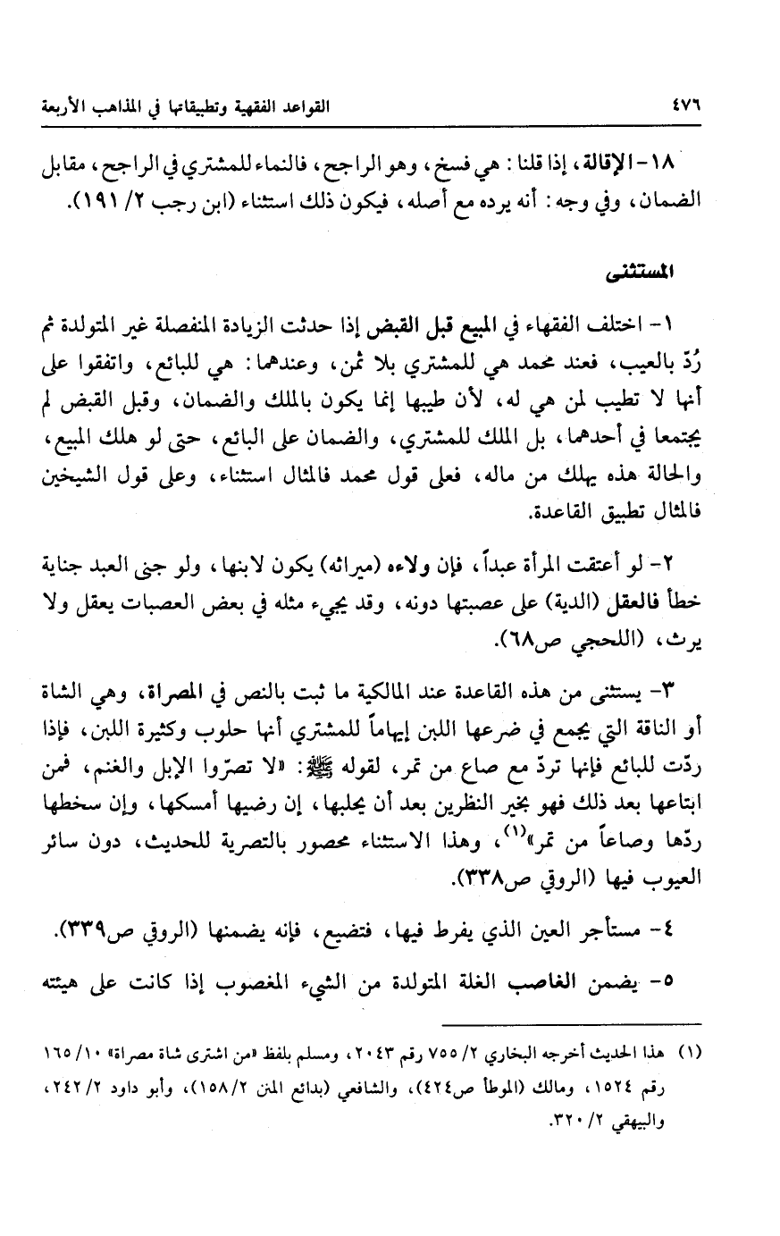 ٣ - يستثنى من هذه القاعدة عند المالكية ما ثبت بالنص في المصراة، وهي الشاة أو الناقة التي يجمع في ضرعها اللبن إيهاماً للمشتري أنها حلوب وكثيرة اللبن، فإذا ردّت للبائع فإنها تردّ مع صاع من تمر، لقوله - صلى الله عليه وسلم -: " لا تصرّواً الإبل والغنم، فمن ابتاعها بعد ذلك فهو بخير النظرين بعد أن يحلبها، إن رضيها أمسكها، وإن سخطها ردّها وصاعاً من تمر".
