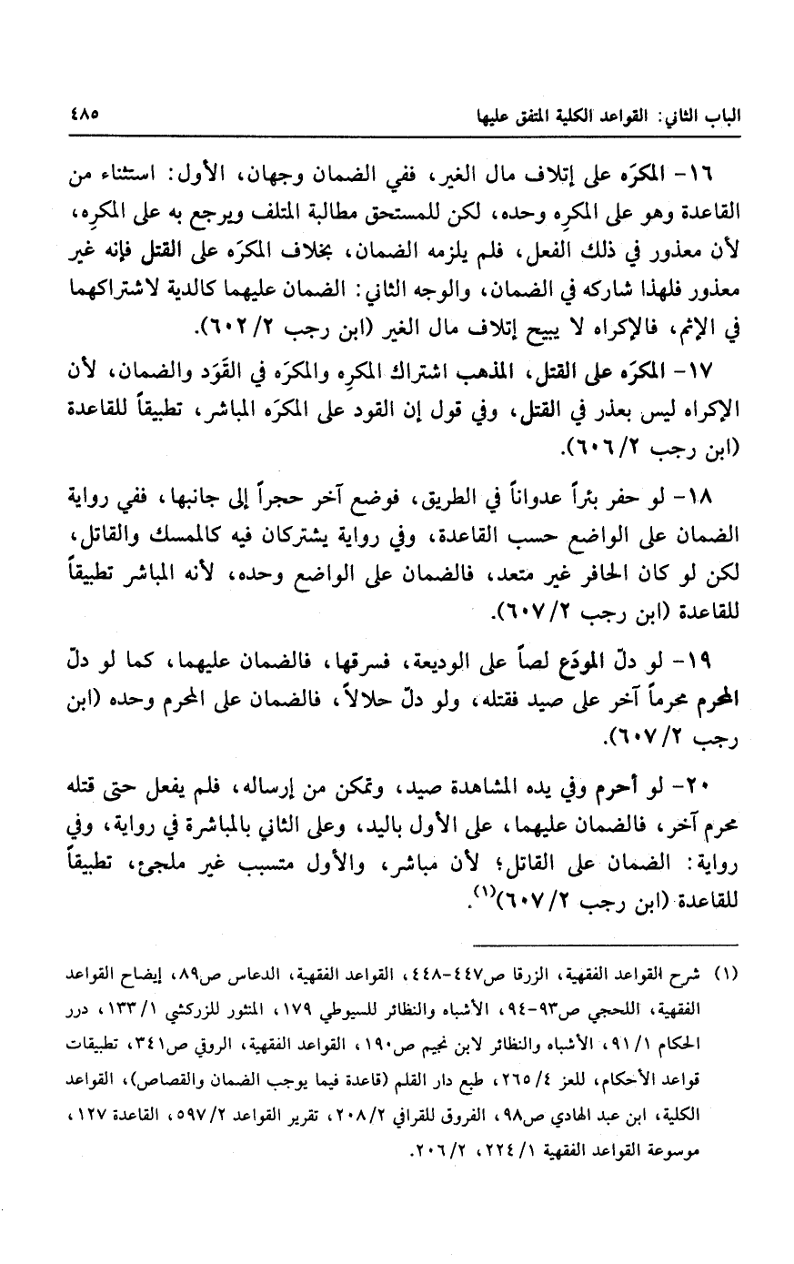 ١٧ - المكرَه على القتل، المذهب اشتراك المكرِه والمكرَه في القَوَد والضمان، لأن الإكراه ليس بعذر في القتل، وفي قول إن القود على المكرَه المباشر، تطبيقاً للقاعدة.