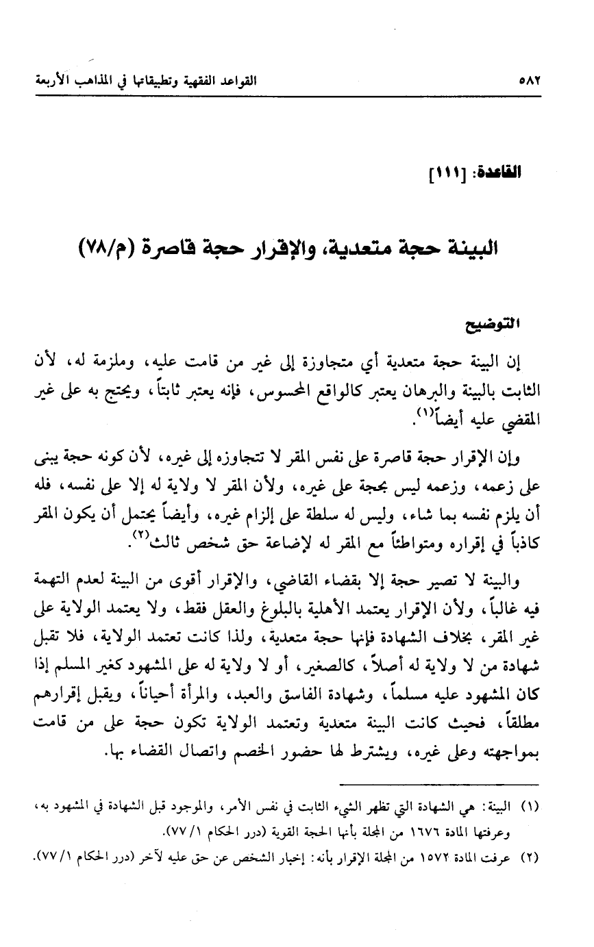 البينة حجة متعدية، والإقرار حجة قاصرة (م/٧٨)