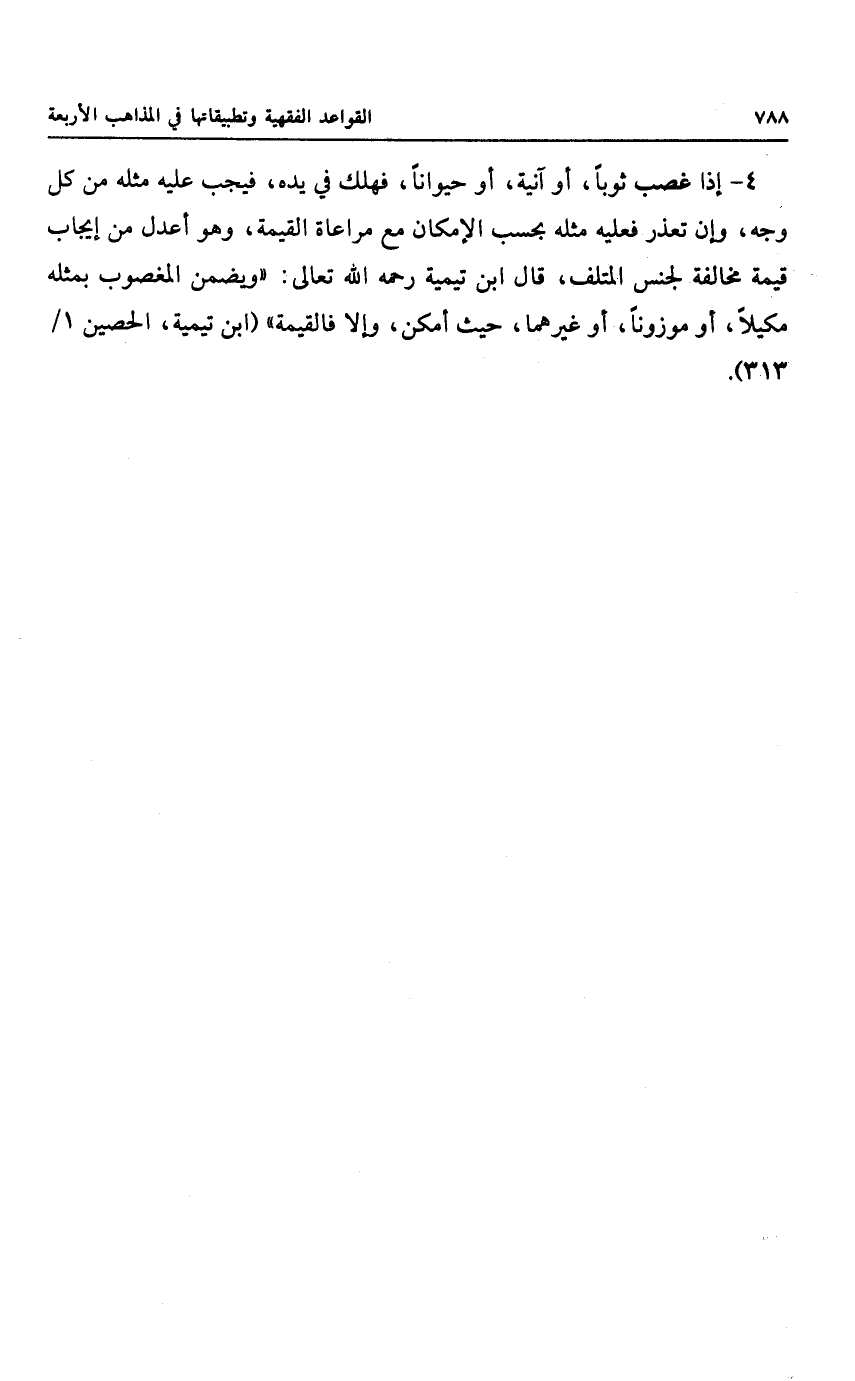 ٤ - إذا غصب ثوباً، أو آنية، أو حيواناً، فهلك في يده، فيجب عليه مثله من كل وجه، وإن تعذر نعليه مثله بحسب الإمكان مع مراعاة القيمة، وهو أعدل من إيجاب قيمة مخالفة لجنس المتلف.