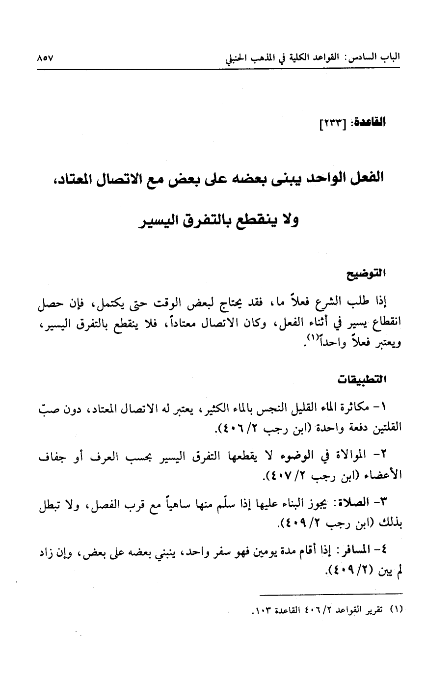 انقطاع يسير في أثناء الفعل، وكان الاتصال معتاداً، فلا ينقطع بالتفرق اليسير، ويعتبر فعلاً واحداً.