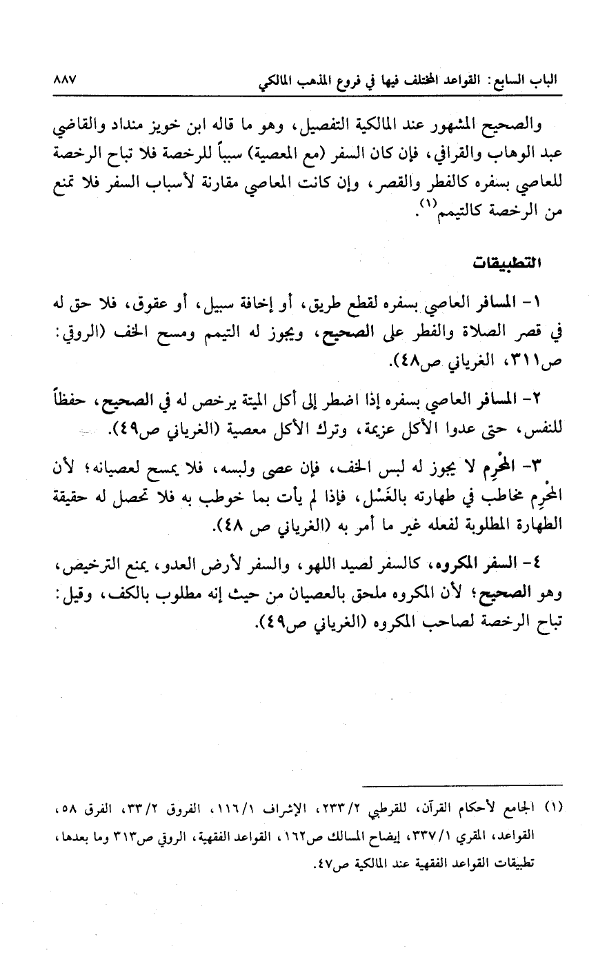 والصحيح المشهور عند المالكية التفصيل، وهو ما قاله ابن خويز منداد والقاضي عبد الوهاب والقرافي، فإن كان السفر (مع المعصية) سبباً للرخصة فلا تباح الرخصة للعاصي بسفره كالفطر والقصر، وإن كانت المعاصي مقارنة لأسباب السفر فلا تمنع من الرخصة كالتيمم.