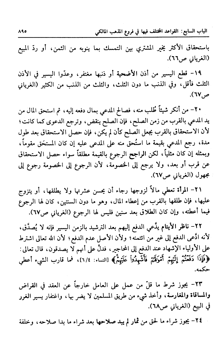 والمساقاة والمغارسة، وأخذ شيء من طريق المسلمين لا يضر بها، واغتفار يسير الغرر في البيع.