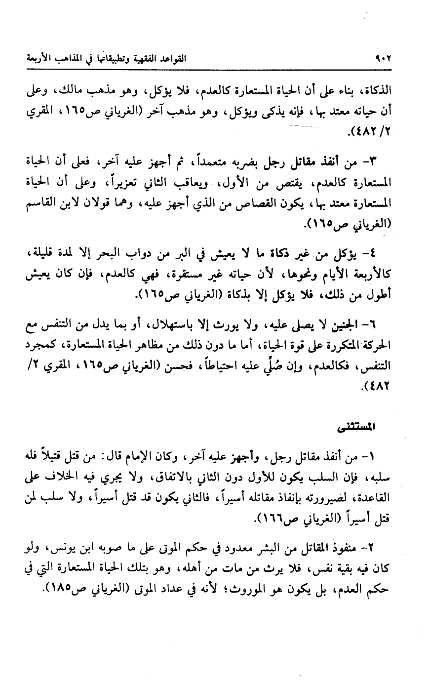 ٢ - منفوذ المقاتل من البشر معدود في حكم الموتى على ما صوبه ابن يونس، ولو كان فيه بقية نفس، فلا يرث من مات من أهله، وهو بتلك الحياة المستعارة التي في حكم العدم، بل يكون هو الموروث؛ لأنه في عداد الموتى (الغرياني ص ١٨٥) .