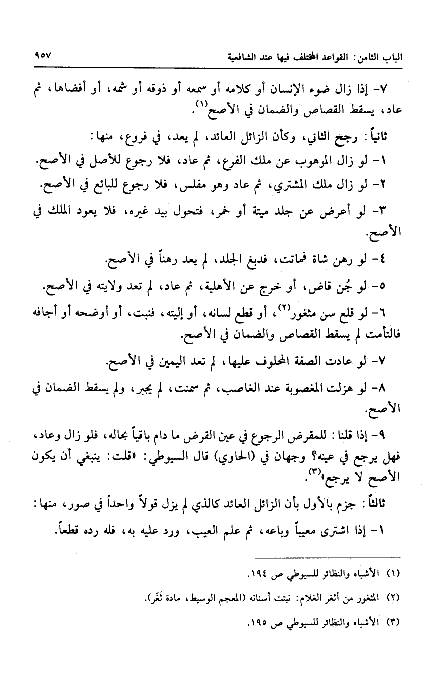 ٧ - إذا زال ضوء الإنسان أو كلامه أو سمعه أو ذوقه أو شمه، أو أفضاها، ثم عاد، يسقط القصاص والضمان في الأصح.