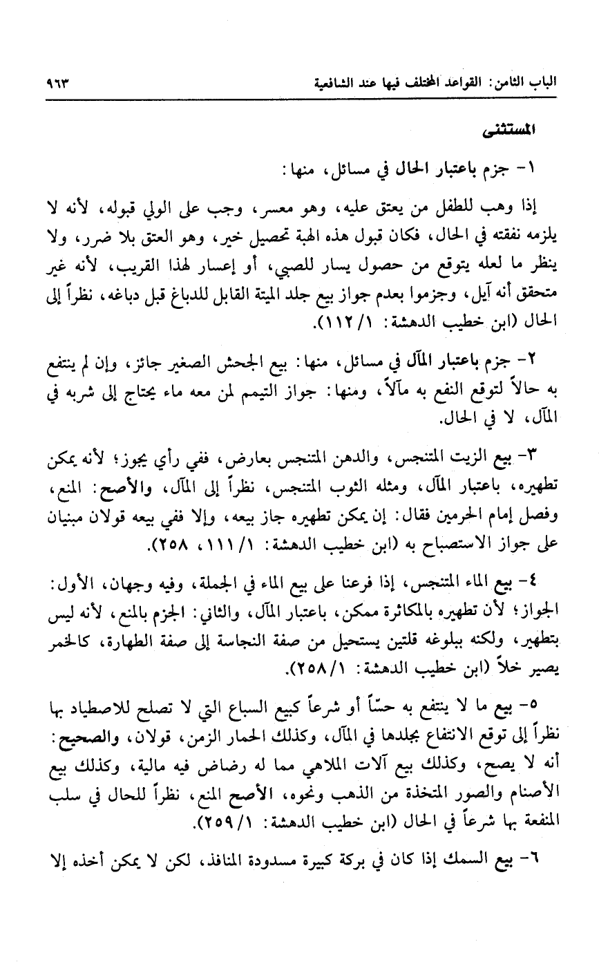 ٤ - بيع الماء المتنجس، إذا فرعنا على بيع الماء في الجملة، وفيه وجهان، الأول: الجواز؛ لأن تطهيره بالمكاثرة يمكن، باعتبار المآل، والثاني: الجزم بالمنع، لأنه ليس بتطهير، ولكنه ببلوغه قلتين يستحيل من صفة النجاسة إلى صفة الطهارة، كالخمر يصير خلاً.