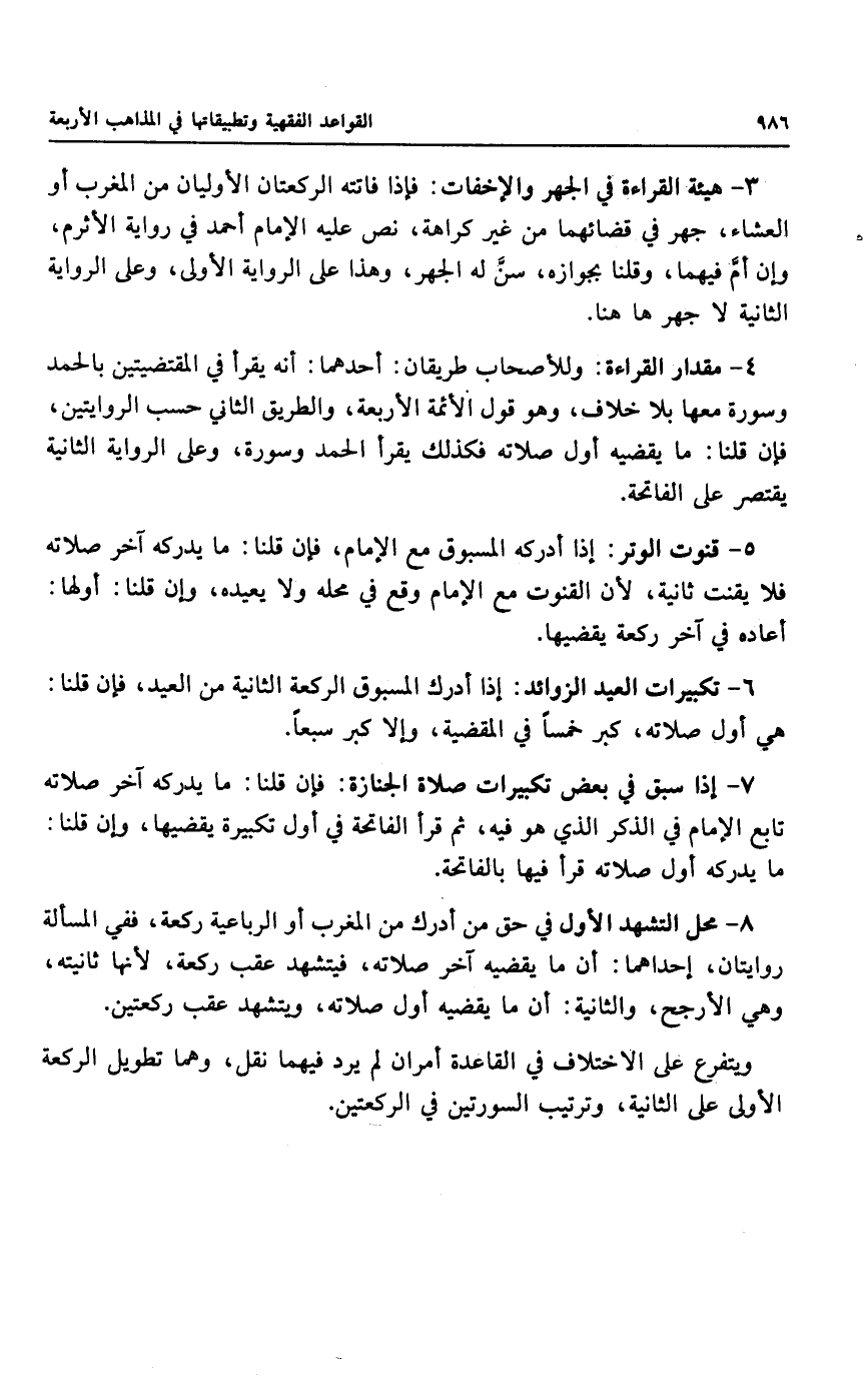 ٨ - محل التشهد الأول في حق من أدرك من المغرب أو الرباعية ركعة، ففي المسألة روايتان، إحداهما: أن ما يقضيه آخر صلاته، فيتشهد عقب ركعة، لأنها ثانيته، وهي الأرجح.