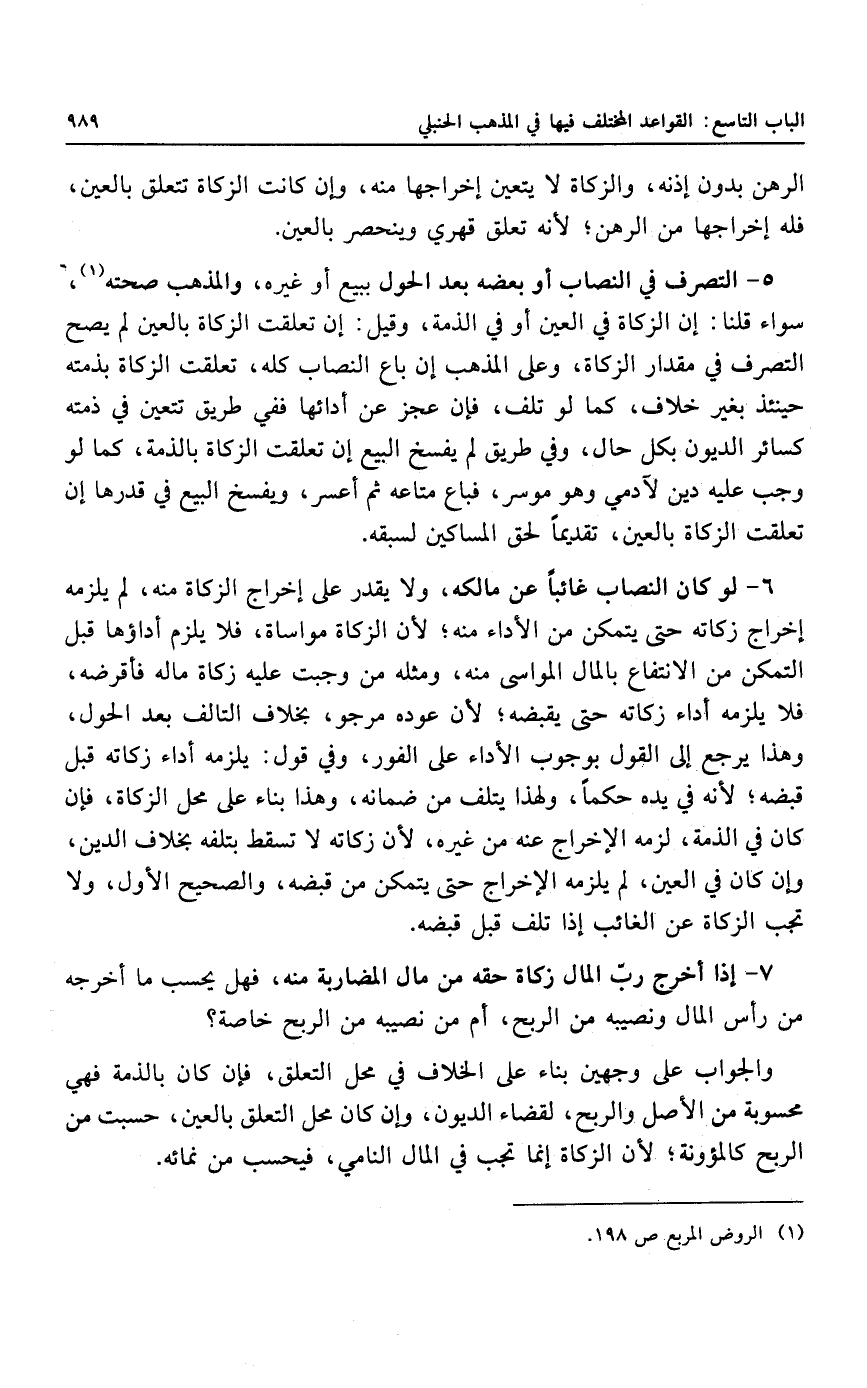 ٥ - التصرف في النصاب أو بعضه بعد الحول ييع أو غيره، والمذهب صحنه، سواء قلنا: إن الزكاة في العين أو في الذمة، وقيل: إن تعلقت الزكاة بالعين لم يصح التصرف في مقدار الزكاة، وعلى المذهب إن باع النصاب كله، تعلقت الزكاة بذمته حينئذ بغير خلاف، كما لو تلف، فإن عجز عن أدائها ففي طريق تتعين في ذمته كسائر الديون بكل حال، وفي طريق لم يفسخ البيع إن تعلقت الزكاة بالذمة، كما لو وجب عليه دين لآدمي وهو موسر، فباع متاعه ثم أعسر، ويفسخ البيع في قدرها إن