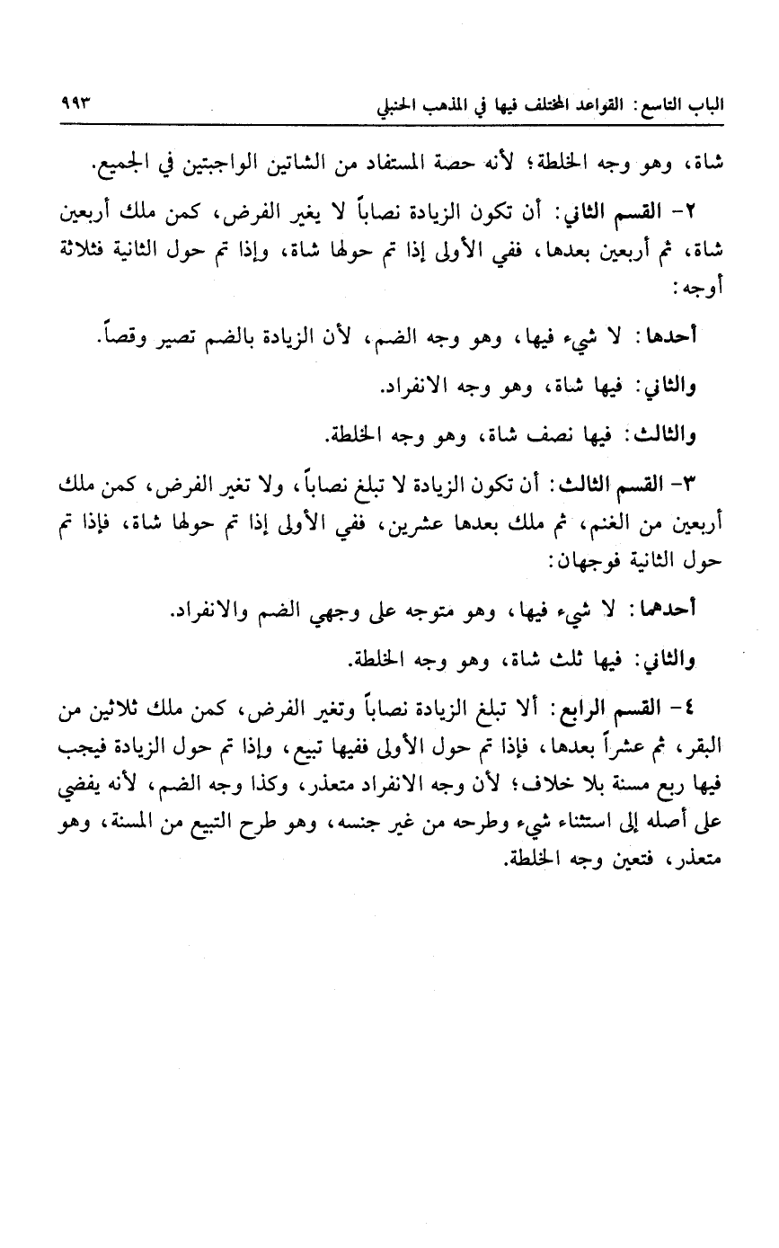 ٤ - القسم الرابع: ألا تبلغ الزيادة نصاباً وتغير الفرض، كمن ملك ثلاثين من البقر، ثم عشراً بعدها، فإذا تم حول الأولى ففيها تبيع، وإذا تم حول الزيادة فيجب فيها ربع مسنة بلا خلاف؛ لأن وجه الانفراد متعذر، وكذا وجه الضم، لأنه يفضي على أصله إلى استثناء شيء وطرحه من غير جنسه، وهو طرح التبيع من المسنة، وهو متعذر، فتعين وجه الخلطة.