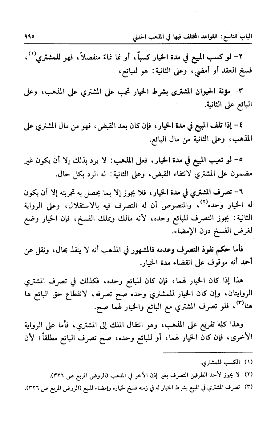 ٣ - مؤنة الحيوان المشترى بشرط الخيار تجب على المشتري على المذهب، وعلى البائع على الثانية.
