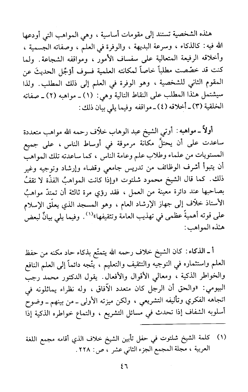 أولاً - مواهبه: أوتي الشيخ عبد الوهاب خلاّف رحمه اللّه مواهب متعددة