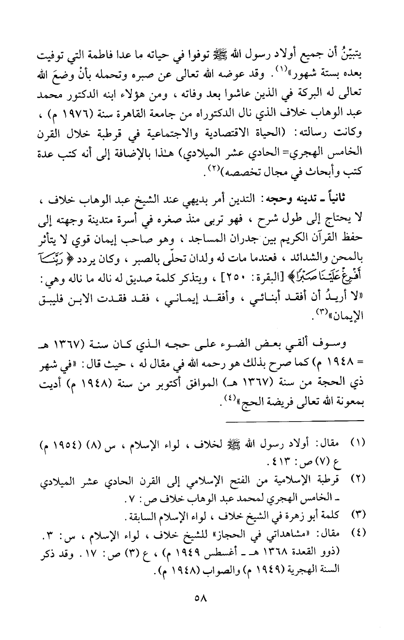 ثانياً - تدينه وحجه: التدين امر بديهي عند الشيخ عبد الوهاب خلاف،