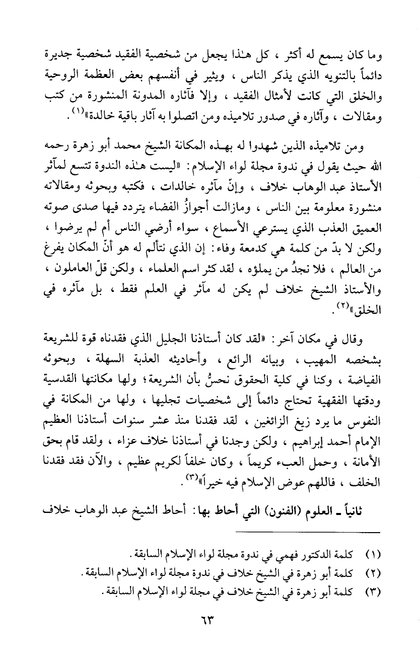 الأستاذ عبد الوهاب خلاف، وإنّ ماَثره خالدات، فكتبه وبحوثه ومقالاته