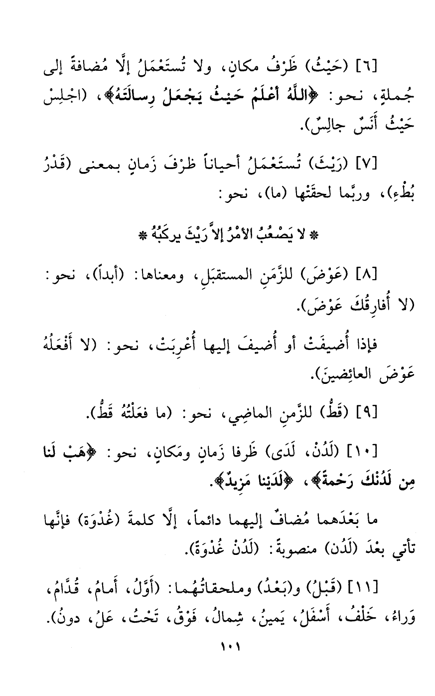 [11] (قَبْلُ) و (بَعْدُ) وملحقاتُهُما: (أَوَّلُ، أَمامُ، قُدَّامُ، وَراءُ، خَلْفُ، أَسْفَلُ، يَمينُ، شِمالُ، فَوْقُ، تَحْتُ، عَلُ، دونُ).