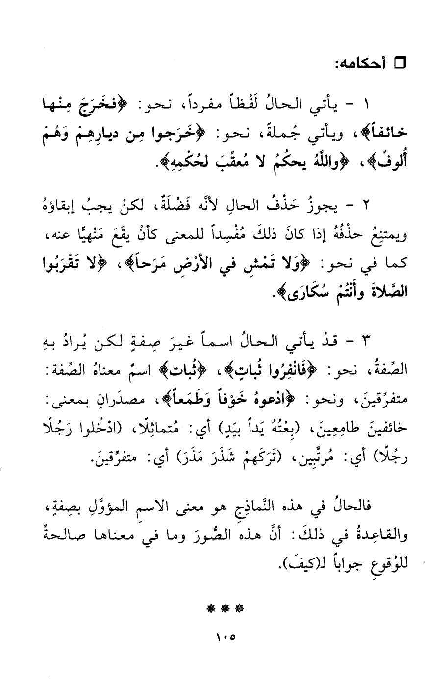 3 - قدْ يأتي الحالُ اسماً غيرَ صِفةٍ لكن يرادُ بهِ الصِّفةُ، نحو: {فَانْفِرُوا ثُباتٍ}، {ثُبات} اسمٌ معناهُ الصِّفة: متفرِّقينَ، ونحو: {ادْعوهُ خَوْفاً وَطَمَعاً}، مصدَرانِ بمعنى: خائفينَ طامِعِينَ، (بِعْتُهُ يَداً بيَدٍ) أي: مُتماثِلاً، (ادْخُلوا رَجُلاً رجُلًا) أي: مُرتَّبِين، (تَرَكَهمْ شَذَرَ مَذَرَ) أي: متفرِّقينَ.