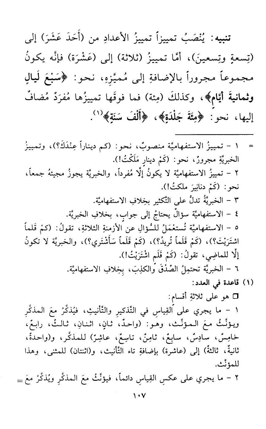 تنبيه: يُنْصَبُ تمييزاً تمييزُ الأعدادِ من (أَحَدَ عَشَرَ) إلى (تِسعةٍ وتِسعينَ)، أمَّا تمييزُ (ثلاثة) إلى (عَشْرَة) فإنَّه يكونُ مجموعاً مجروراً بالإضافةِ إلى مُميَّزِهِ، نحو: {سَبْعَ لَيالٍ وثمانيةَ أيَّامٍ}، وكذلكَ (مِئة) فما فوقَها تمييزُها مُفرَدٌ مُضافٌ إليها، نحو: {مِئَةَ جَلْدَةٍ}، {أَلْفَ سَنَةٍ} (¬1).