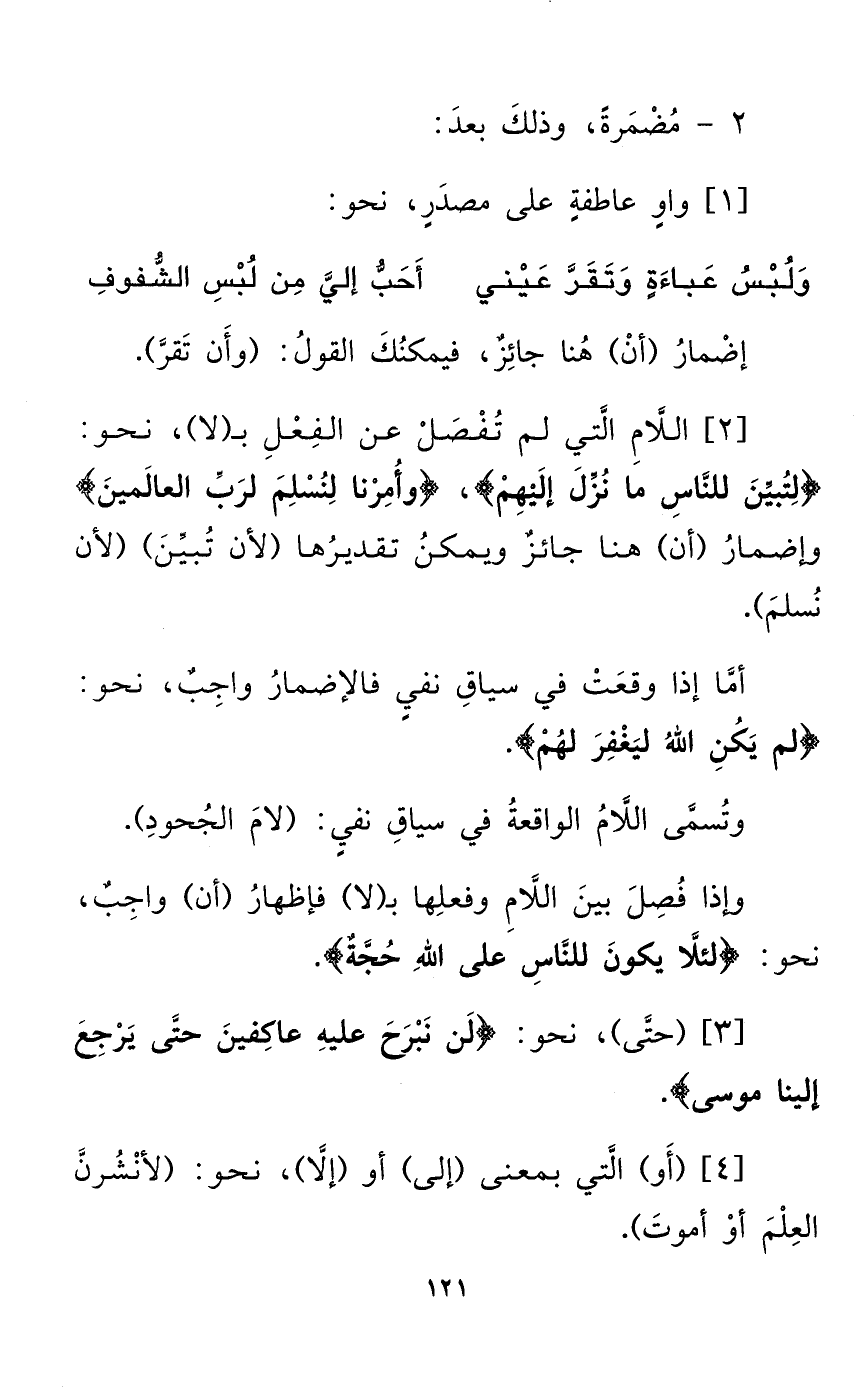 [2] اللَّامِ الَّتي لم تُفْصَلْ عن الفِعْلِ بـ (لا)، نحو: {لِتُبيِّنَ للنَّاسِ ما نُزِّلَ إلَيهِمْ}، {وأُمِرْنا لِنُسْلِمَ لرَبِّ العالَمينَ} وإضمارُ (أن) هنا جائزٌ ويمكنُ تقديرُها (لأن تُبيِّنَ) (لأن نُسلمَ).