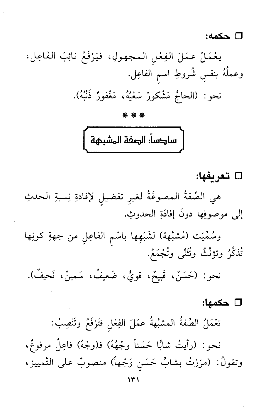 وسُمِّيَت (مُشبَّهة) لشَبَهِها باسْمِ الفاعِلِ من جهةِ كونِها تُذكَّرُ وتؤنَّثُ وتُثَنَّى وتُجْمَعُ.