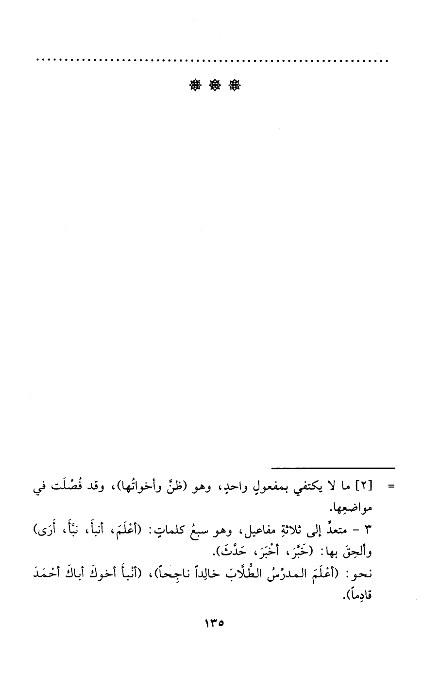 3 - متعدٍّ إلى ثلاثةِ مفاعيل، وهو سبعُ كلماتٍ: (أعْلَمَ، أنبأَ، نبَّأَ، أَرَى) وألحِقَ بها: (خَبَّرَ، أخْبَرَ، حَدّثَ).