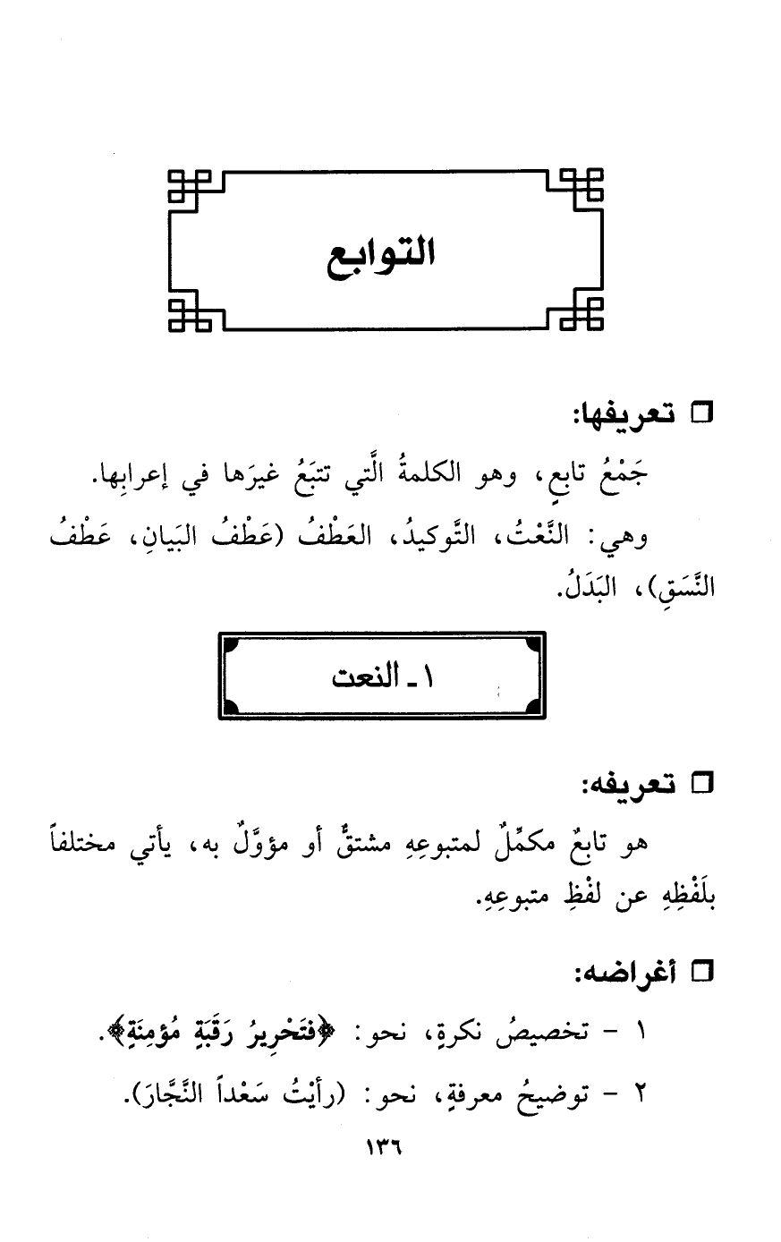 وهي: النَّعْتُ، التَّوكيدُ، العَطْفُ (عَطْفُ البَيانِ، عَطْفُ النَّسَقِ)، البَدَلُ.