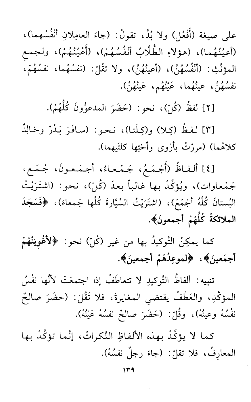 [4] ألفاظُ (أَجْمَعُ، جَمْعاءُ، أجمَعونَ، جُمَع، جَمْعاوات)، ويُؤكَّدُ بها غالباً بعدَ (كُلّ)، نحو: (اشتَرَيْتُ البُستانَ كُلَّهُ أجْمَعَ)، (اشتَرَيْتُ السَيَّارةَ كُلَّها جَمعاءَ)، {فَسَجَدَ الملائكةُ كُلُّهُمْ أجمعونَ}.